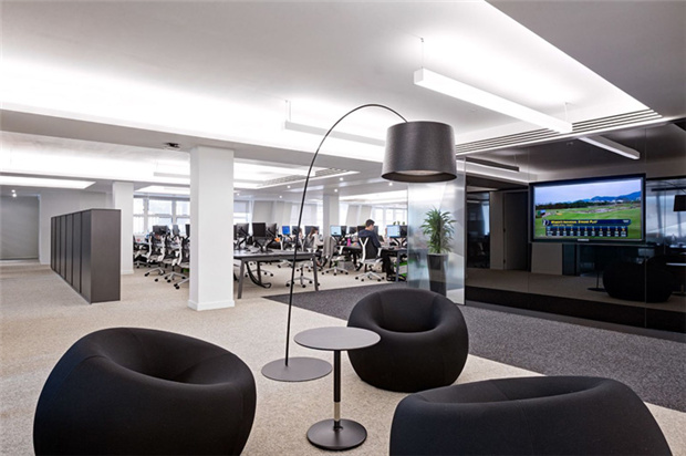 4、某知名品牌投資管理公司辦公室裝修:開放辦公區域作為整體員工工作區域,保證員工舒適性,提高工作效率,天花黑格吊頂,天花用暖色的燈裝飾,地面沒有過多的造型,整體營造的氛圍很和諧。辦公室休閑區設計:明朗的色調,具有開放式的格局,員工置身于靈動的環境下,思維打開,工作效率極高。